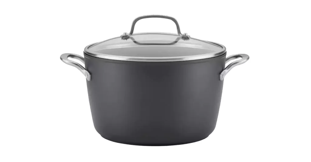 A hard anodized stock pot is a durable and non-reactive cooking vessel with a smooth, hard surface. Its aluminum construction